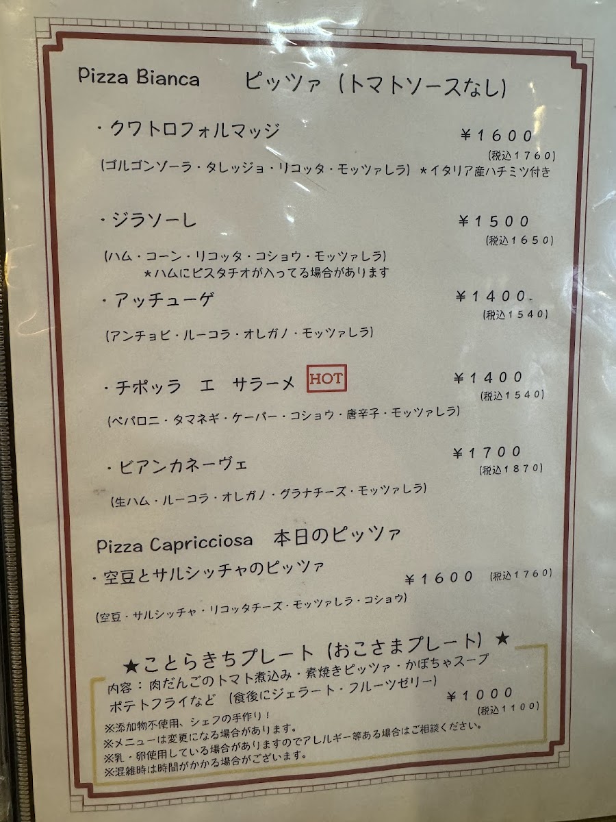 The menu at Pizzeria Da Torachici offers a delightful array of Italian classics with a Japanese twist. Among the standout dishes is the マルゲリータ, a fresh and flavorful pizza with a perfect balance of tangy tomato sauce, creamy mozzarella, and aromatic basil. Another crowd favorite is the indulgent クワトロ フォルマッジ, a rich four-cheese pizza that is a true treat for cheese lovers. For something unique, the ビアンカネーヴェ pizza, featuring a white sauce base and a variety of cheeses, is a must-try. Alongside these, the restaurant serves a refreshing ランチのサラダ, which is a great start to any meal, offering crisp greens dressed in a light vinaigrette. For those looking to complement their meal, a cold 生ビール 中 (draft beer) is the perfect pairing, ensuring a satisfying dining experience. To top it off, the コースサラダ provides a variety of seasonal vegetables that add a burst of freshness to the meal. Each dish is crafted with care, making Pizzeria Da Torachici a must-visit for pizza enthusiasts in Nishinomiya.